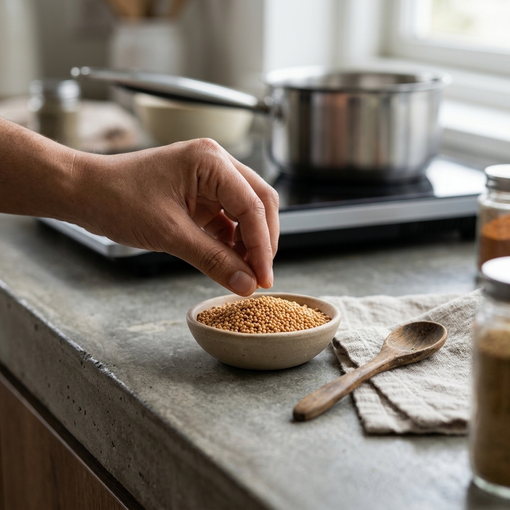 Ev Yapımı Gurme Hardal: Tohumları hafifçe ezerek sirke, su ve bal ile karıştırıp kendi doğal hardal sosunuzu hazırlayın. 🍯🥣